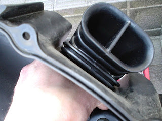 取り外したエアクリーナーボックス上部。合わせて温度センサーのカプラを外します。 あとバッテリーボックス側のネジを外すために、ラゲッジ側のアクセスパネルを外す必要があります。